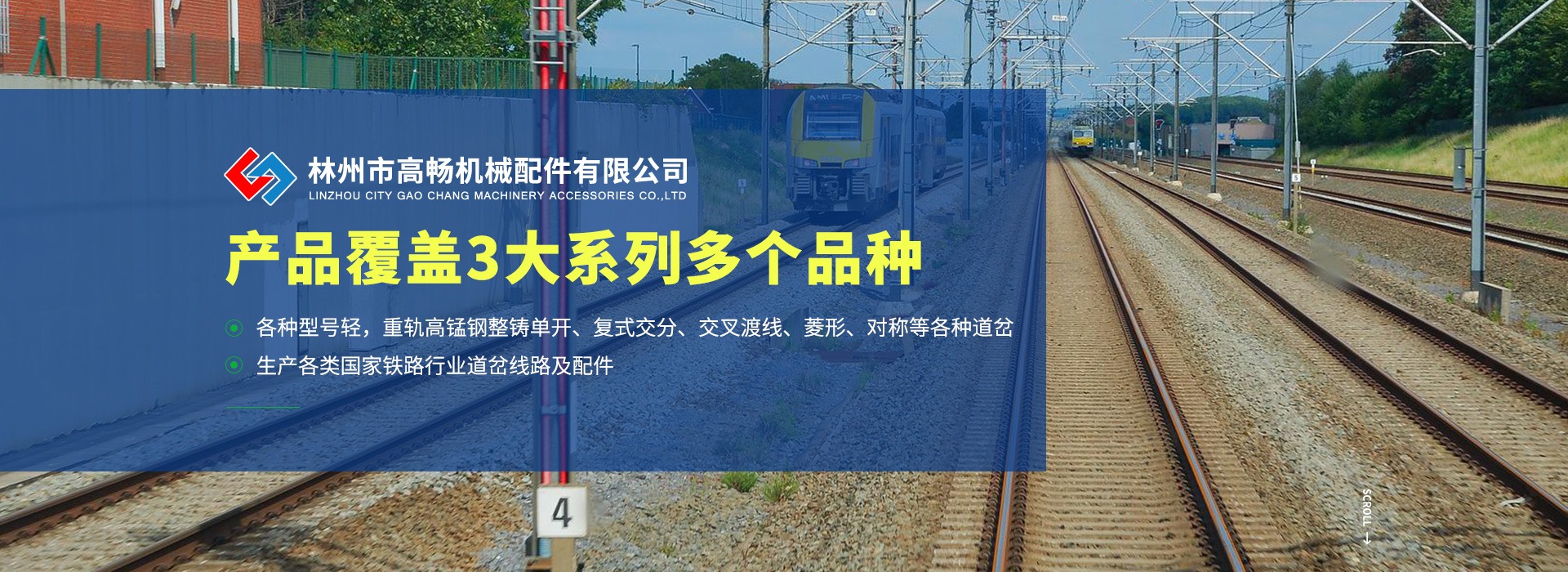 我廠主要產品有:各種型號輕,重軌高錳鋼整鑄單開、復式交分、交叉渡線、菱形、對稱等各種道岔。按軌型區分有:8kg/m、12kg/m、15kg/m、18kg/m、22kg/m、24kg/m、30kg/m、38kg/m、43kg/m、50kg/m、60kg/m鋼軌用的道岔。按道岔號碼區分有:2號、3號、4號、5號、6號、7號、8號、9號、12號等道岔。 線路配件有螺旋道釘、各種扣扳、鐵座、普通拉桿、絕緣拉桿、魚尾羅栓、防爬器、墊板以及各種道岔的零配件、橋梁護軌配件等品種。行車配件有各種型號的壓板、羅栓、膠墊、焊接式壓軌器等品種。產品覆蓋3大系列多個品種。